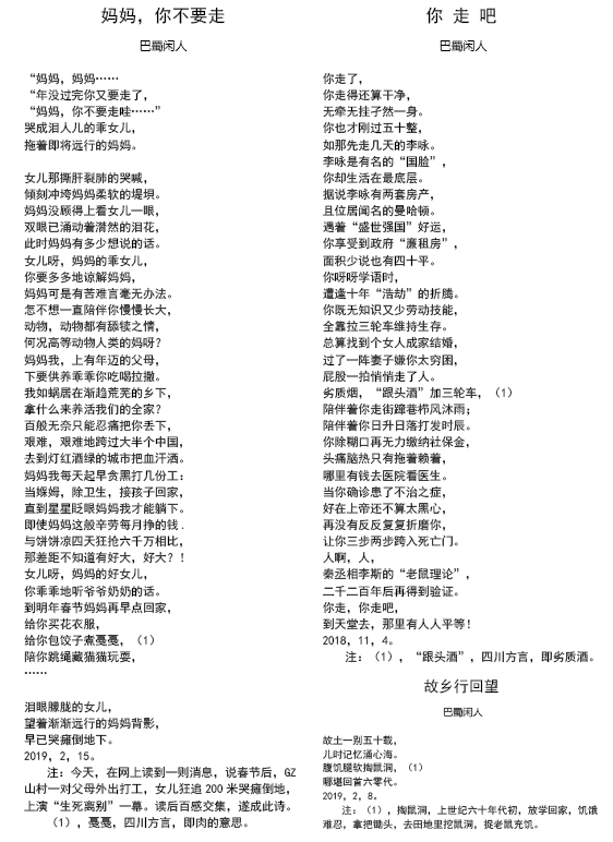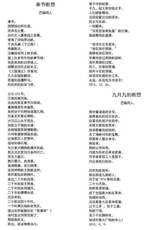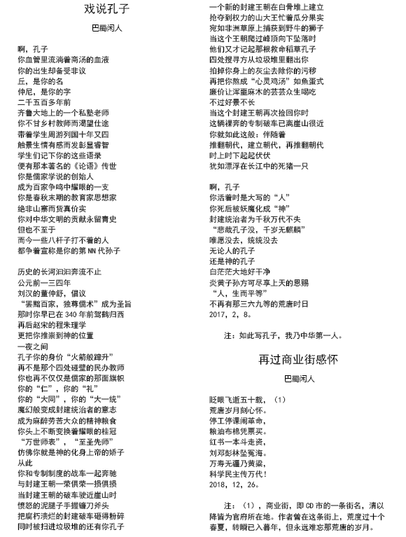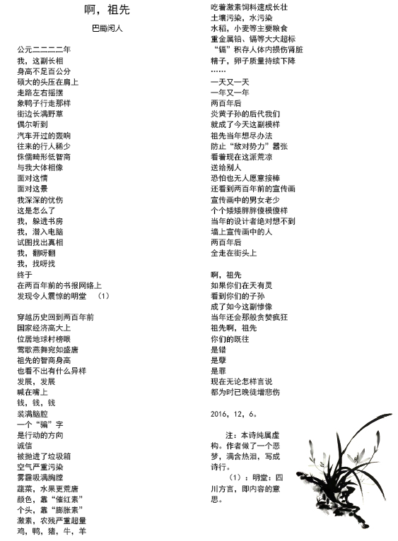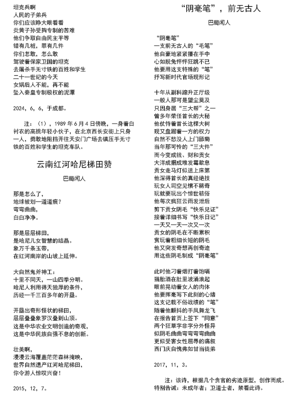 何基富,男,“巴蜀闲人”乃笔名,著名诗人,思想家。1945年10月生,四川省营山县人,大学文化。青少年励志勤奋,1965年以德才备兼,高考状元之身,保送至四川省委办公厅。亲历十年“文革”嚣喧。1975年任巜四川青年杂志》副总编辑;后来又担任过两份省级内刊总编辑。中国世界民族文化交流促进会特约研究员;北京炎黄文化研究院高级研究员;华夏传统文化研究院授予“文学功勋人物”;中央新影中学生频道授予“最具影响力艺术名家”。七十年代初,开始习诗,跨进暮春门槛,提起秃笔,挤上诗坛,誓为后人为民族,留下时代的真言。