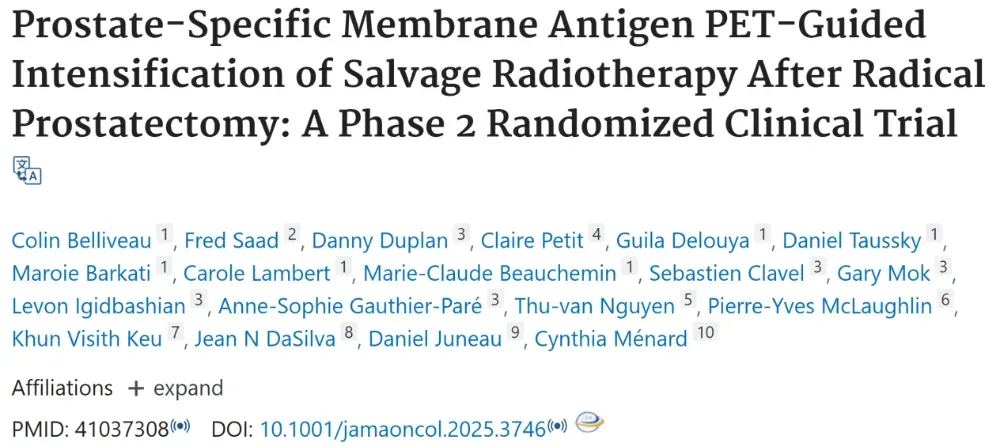 Belliveau C, Saad F, Duplan D, et al. Prostate-Specific Membrane Antigen PET-Guided Intensification of Salvage Radiotherapy After Radical Prostatectomy: A Phase 2 Randomized Clinical Trial. [J/OL]JAMA Oncol. Published online October 2, 2025. doi:10.1001/jamaoncol.2025.3746