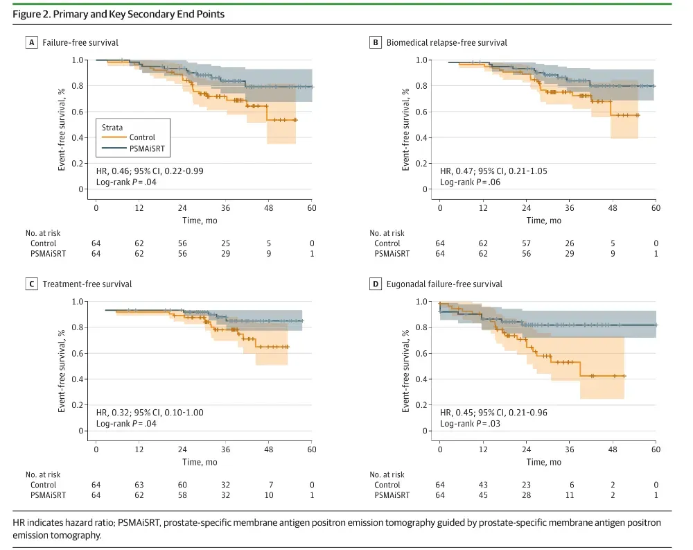 在意向治疗人群中,86例(67%)完成短期ADT并恢复至睾酮≥5.2 ng/dL;从达到正常睾酮算起,实验组中位失败时间尚未达到,对照组为22.3个月,HR 0.45(0.21-0.96,P=0.03,图2D)。作者认为,强化放疗清除潜在微转移,可减少睾酮回升后早期PSA反弹,对希望保留性功能的间歇ADT策略尤其重要。