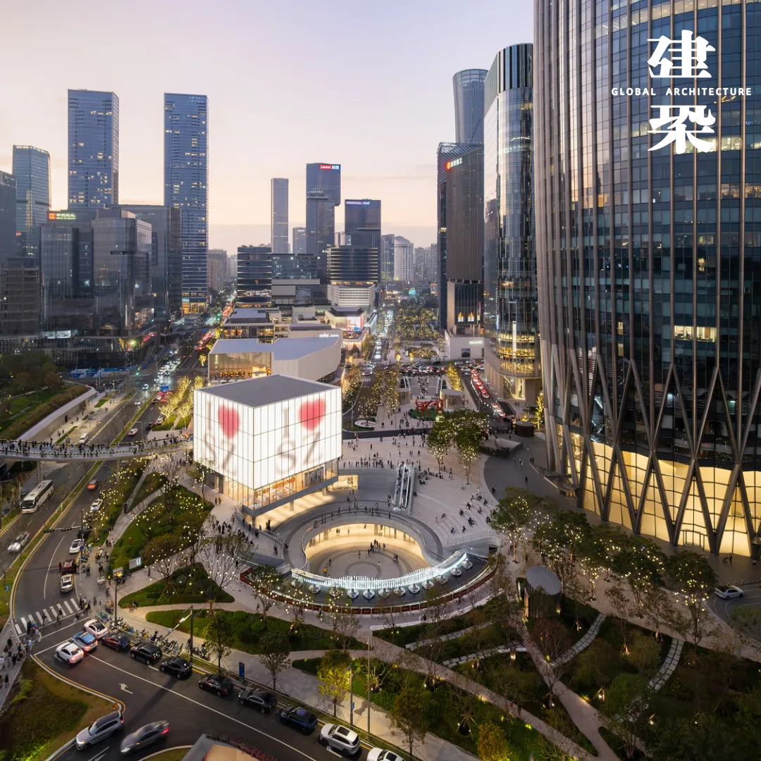 项目由KPF设计,广场充分呼应了所处的环境。尤其是与身旁挺拔的中国华润大厦之间,形成了巧妙而和谐的空间对话。整个广场通过圆形下沉区域,将方形的建筑体、流动的水幕与阶梯景观融为一体,既独立鲜明,又与天际线相衔接。