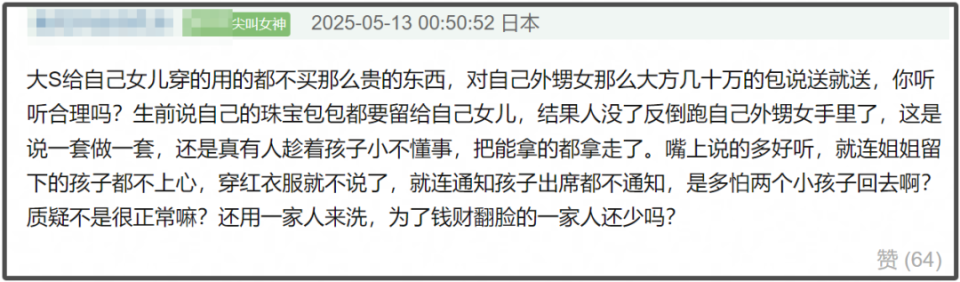 这话说得在理,毕竟大S生前再大方,总不至于把家底全送给外甥女。