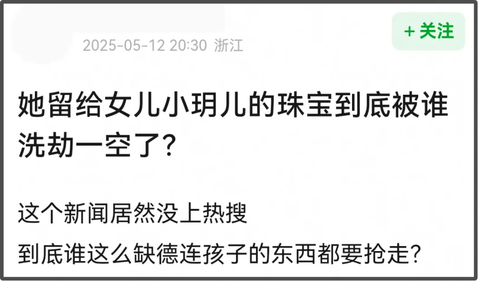 眼下这出豪门悬疑剧演到最关键处,吃瓜群众搬着小板凳等下文。要我说,这事儿光靠网友扒拉也扒拉不出真相,关键还得看当事人愿不愿意给个说法。遗产到底去哪了?是真遭了贼还是另有隐情?咱普通看客也别急着站队,毕竟家家有本难念的经。只盼着这事能早点水落石出,别让两个孩子连点念想都留不住。