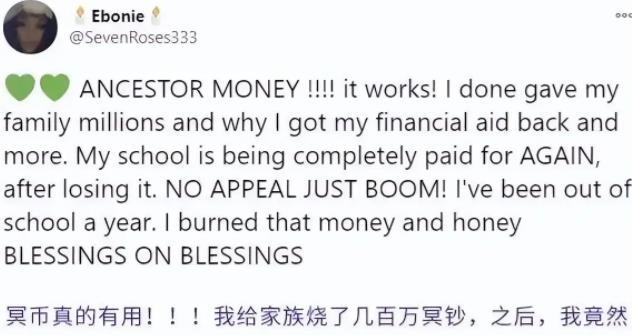 其实一开始,冥币在国外走红,是因为一些外国网友在社交平台上晒出了自己烧纸的照片,还配上各种“许愿成功”的经历,说是什么“东方神秘力量”,这一下子就引起了其他人的兴趣,纷纷跟风去网上搜冥币,买来试试看能不能转运。