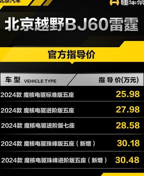 据北京汽车那边传来的消息,北京越野BJ60雷霆系列新增了魔核电驱珠峰版,还细分成了两个款型,分别是魔核电驱珠峰版五座和魔核电驱珠峰进阶版五座,价格嘛,一个30.18万元,一个30.48万元,妥妥的顶配系列。咱先不管它价格怎么样,就说这新成员上市,总会给人带来不少期待。