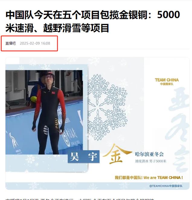 (信源:直播吧2025年2月9日—中国队今天在五个项目包揽金银铜:5000米速滑、越野滑雪等项目)