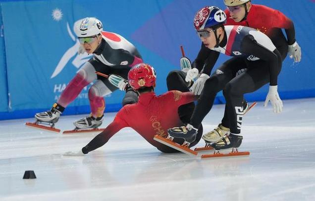 2月9日,亚冬会短道速滑男子5000米接力决赛中,中国队队员在最后时刻滑倒,获得了铜牌。
