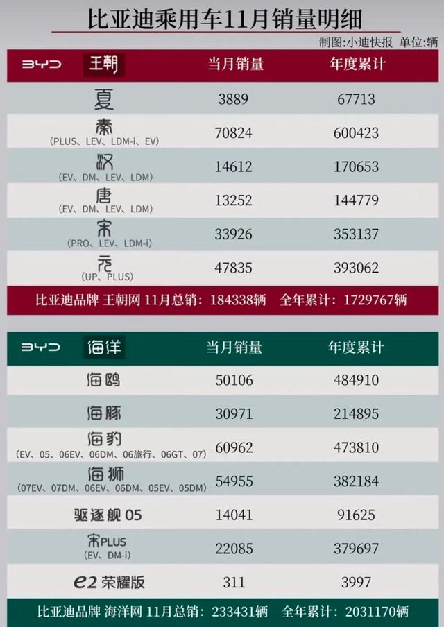 11月份比亚迪的销量又又又再次登顶,销量达到了48万辆,这个成绩固然不错,依旧是国内天花板级别的存在,即便排名老二的吉利,11月份也才仅售出31万,与比亚迪的销量差了一大截。