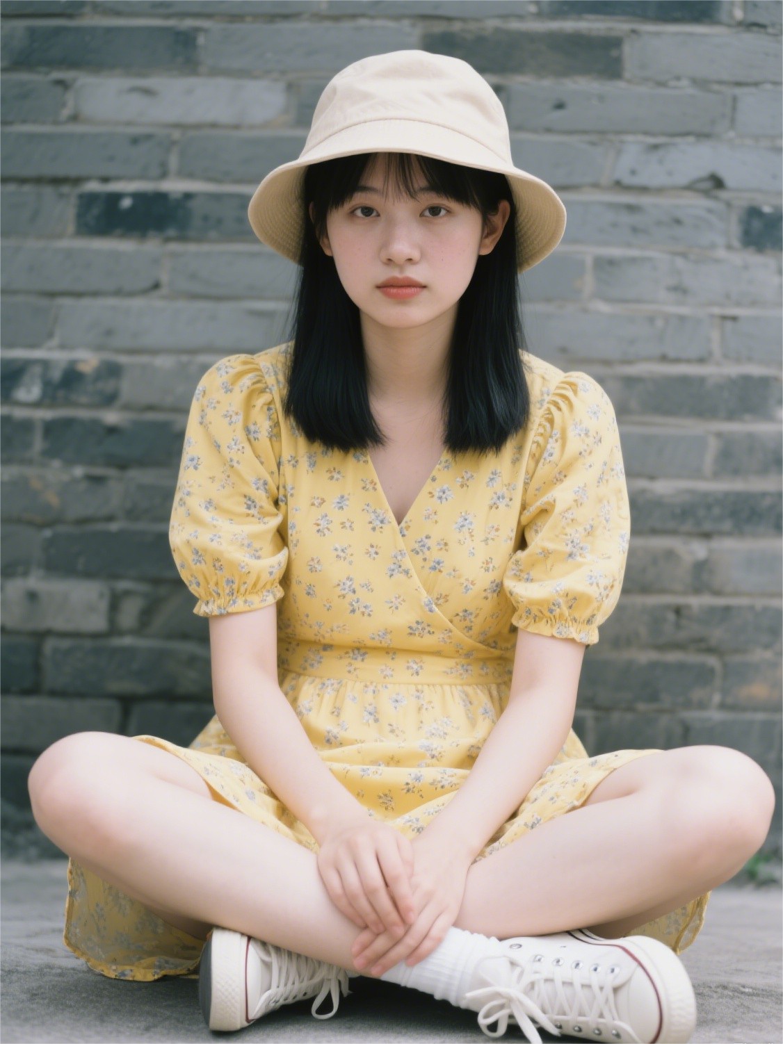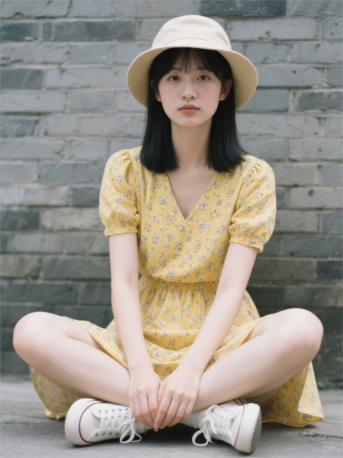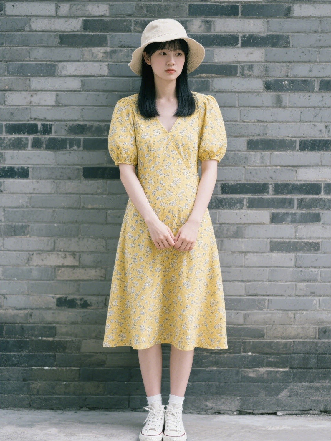 身穿一条明黄色碎花连衣裙,搭配一顶米白色渔夫帽和一双纯白帆布鞋,站在灰砖墙前,自带一股“安静的文艺气息”。这一身,不张扬、不沉闷,既保留了夏天应有的明媚色彩,又充满日常实用感。最重要的是,它让人相信:穿得舒适、得体,本身就是一种高级的状态。