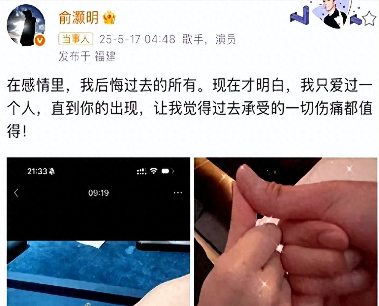 俞灏明和王晓晨结婚的事,最近可热闹了。5月17日晚上,俞灏明突然发照片,是他向王晓晨求婚的画面。他还写了一大段话,说自己多爱王晓晨。