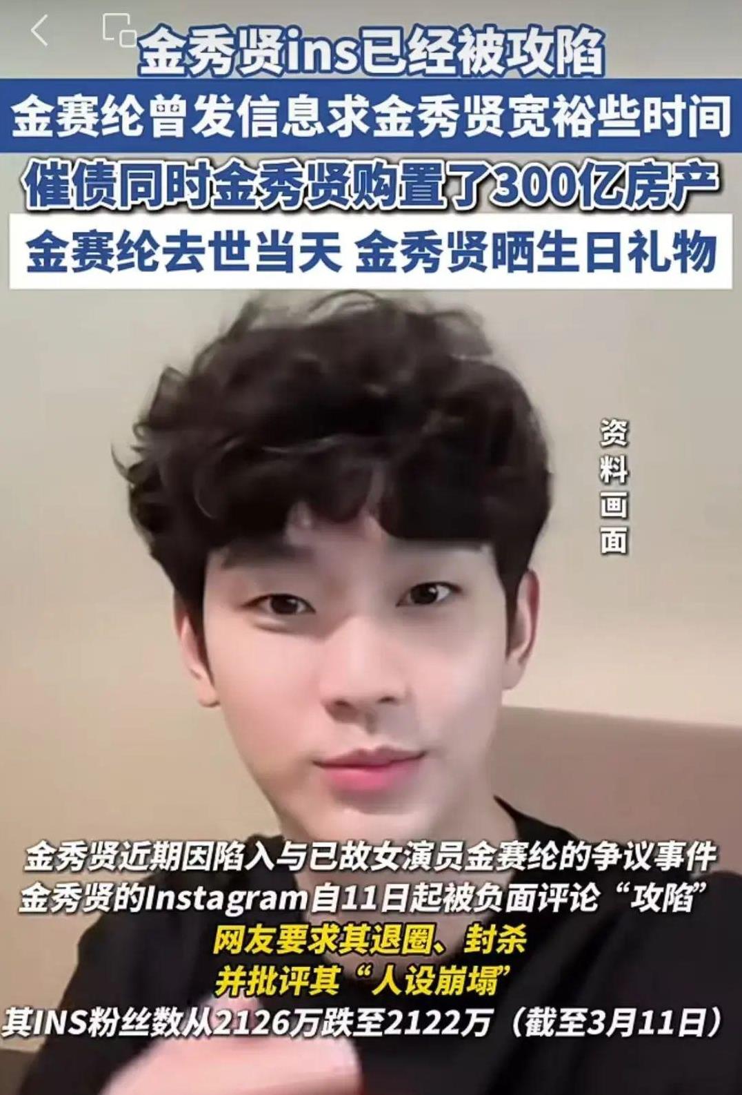 家属说,“她认为自己这样做,对方才会联系她”。当时舆论哗然。金秀贤公司迅速澄清,说这是“公司同事旧照”,俩人没有恋情,之后金赛纶遭到网暴。然后就是上个月(2025年2月16号),金秀贤生日当天,金赛纶ZS了……金秀贤当时在录节目,连她的葬礼都没出席。(还在平台秀生日礼物)