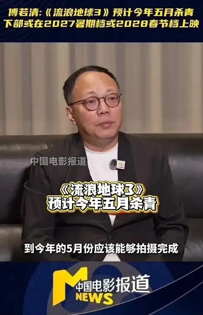 日前,中影集团董事长傅若清透露《流浪地球3》预计2026年5月杀青,《流浪地球3》上部会按原计划2027年春节档上映,下
