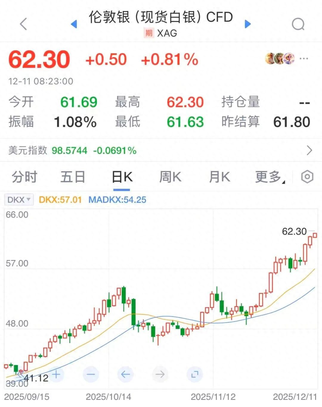 截至发稿时,伦敦现货银价盘中创下62.35美元/盎司的历史新高,伦敦现货金价升至4200美元/盎司上方。
