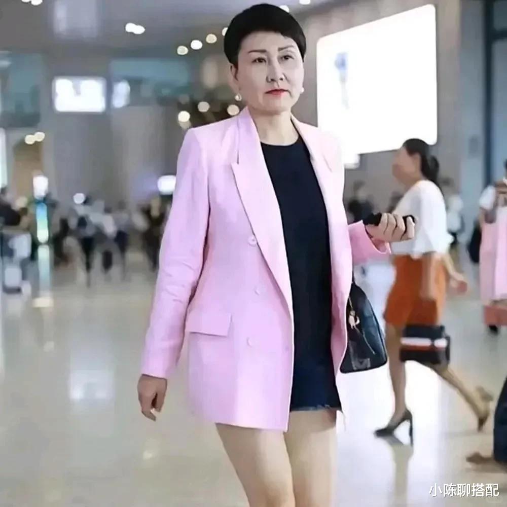 这种服装看似时髦,实则土气难搭配。再结合她男性化的发型和线条硬朗的脸型,怎么看怎么违和,一点都不优雅从容。
