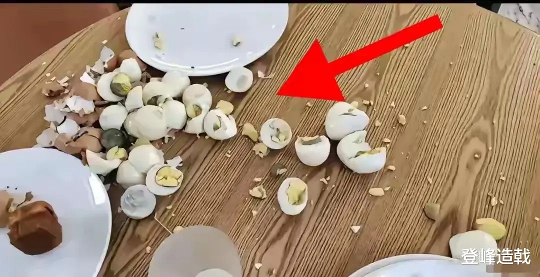 剥完后,又一个个将鸡蛋捏碎,蛋黄和蛋清溅得到处都是,让原本整洁的餐桌变得一片狼藉。