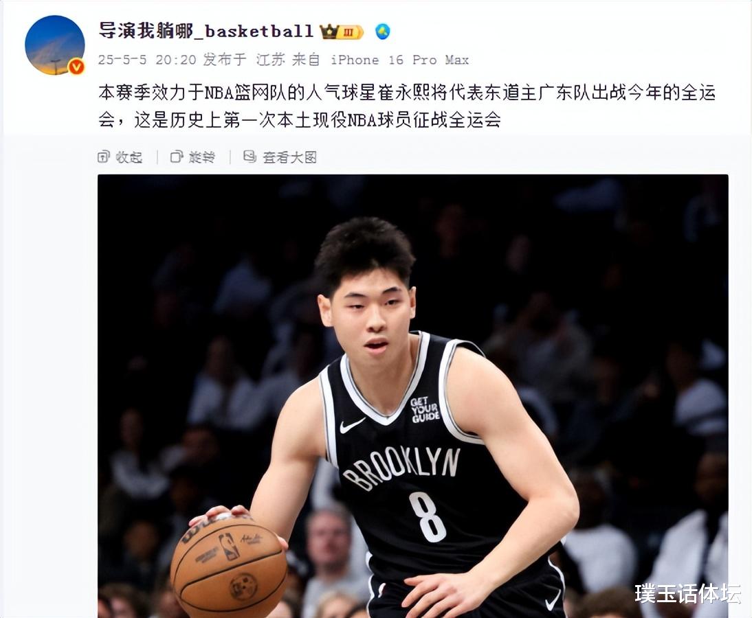 20点20分!据媒体人“导演”透露,本赛季效力于NBA篮网队的人气球星崔永熙将代表东道主广东队出战今年的全运会,这是历史上第一次本土现役NBA球员征战全运会。此消息对于广东全运成年队无疑是利好,锋线位置喜迎强力悍将,将携手杜锋和胡明轩剑指冠军。
