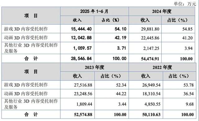 “游戏+动画”也成为原力数字的重要营收来源。其中,来自动画3D内容受托制作的收入正在稳步增长,2022年-2024年、2025年1-6月(下称“报告期”),分别为1.83亿元、2.32亿元、2.24亿元和1.2亿元。
