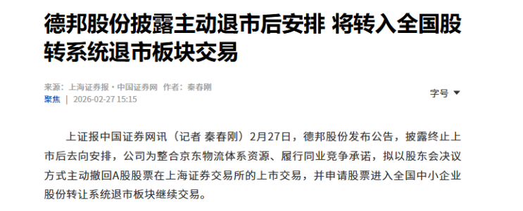 2026年1月29日,德邦股份股东会审议通过了主动终止公司股票上市的议案。2月26日,德邦正式向上交所提交终止上市申请。根据最新公告,退市后德邦将转入全国中小企业股份转让系统退市板块继续交易。