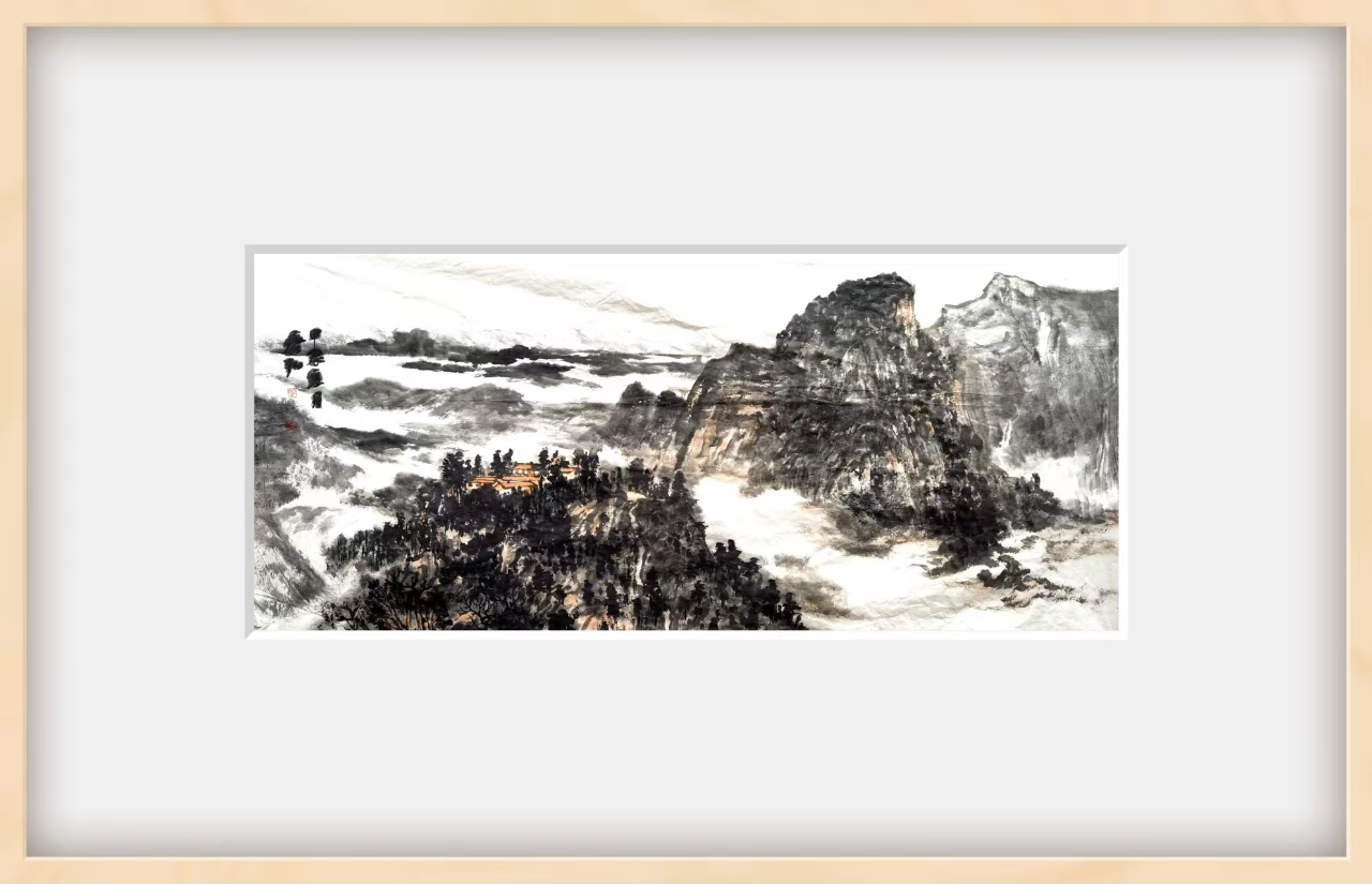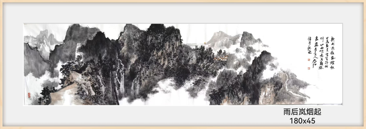 齐宏伟先生的画,不仅有自然之形,更得自然之神。他笔下的山水,不是简单的写实,而是对自然精神的提炼与升华。在《雨后岚烟起》中,云雾缭绕的山峦仿佛有了生命,它们在雨后舒展身姿,呼吸着清新的空气,散发着泥土的芬芳。观者仿佛能听到山风的低语,看到云雾的变幻,感受到大自然的脉搏。