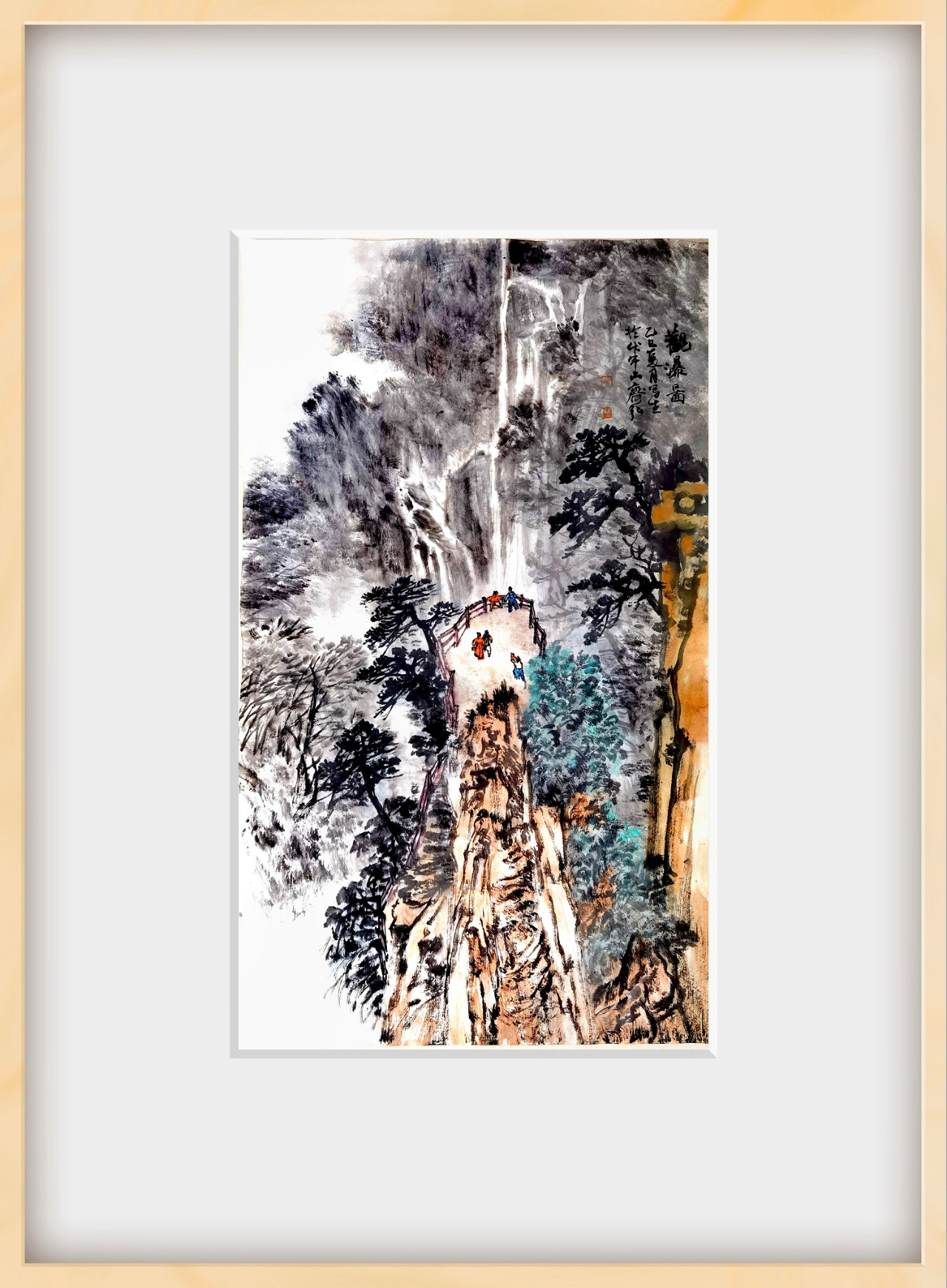 他的构图,宛如一首宏大的交响曲,高低起伏的山峦是跳动的音符,云雾是悠扬的旋律。在《岩泉万丈图》里,高耸的山峰直插云霄,似要冲破画面的束缚,与天际对话;飞瀑流泉如银练般倾泻而下,奏响一曲激昂的生命之歌。画面布局疏密得当,留白之处恰似乐章中的休止符,给人以遐想的空间,让观者的思绪在山水间自由驰骋。