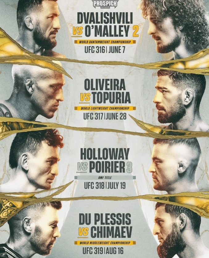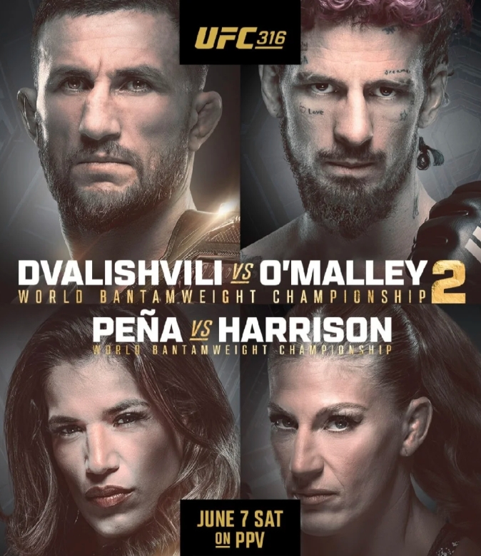 UFC首席执行官白大拿在周二的直播中宣布了UFC 316的主赛事。预计未来几周将确定6月7日的按次付费观赛的完整UFC 316对阵卡。梅拉布·德瓦什维利和肖恩·奥马利将在不到一年的时间内第二次交手,他们将在6月7日于新泽西州纽瓦克举行的UFC 316中领衔主演。白大拿还宣布了UFC女子雏量级冠军朱莉安娜·佩娜将对阵前PFL冠军凯拉·哈里森,这场对决将成为UFC 316的联合主赛事。