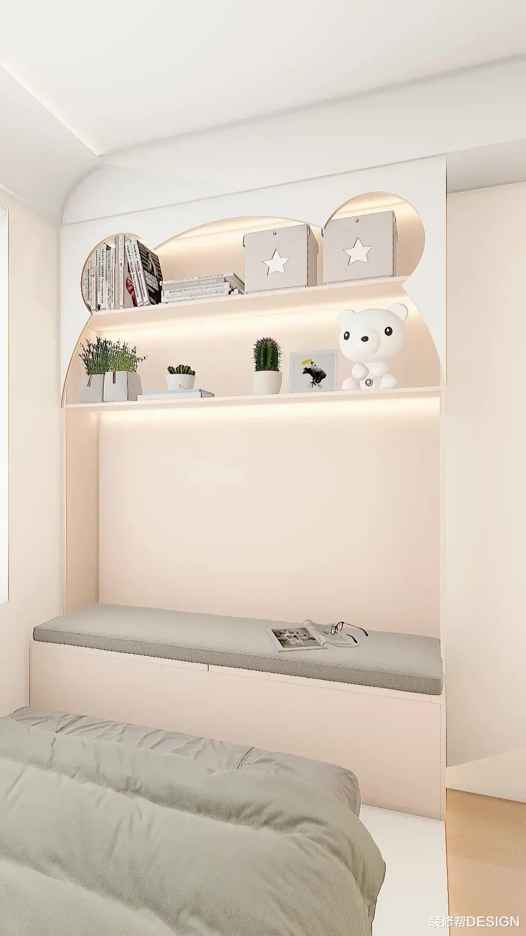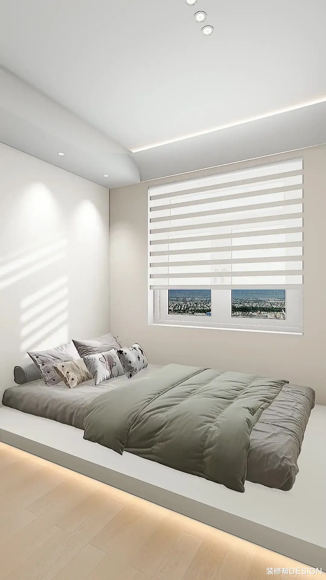 首先,靠近窗户定制大型地台,在其内部暗藏灯带,夜晚开启时,温馨的光线弥漫,氛围感拉满,再嵌入实木排骨架,铺上柔软的床垫,一张舒适的床便应运而生。