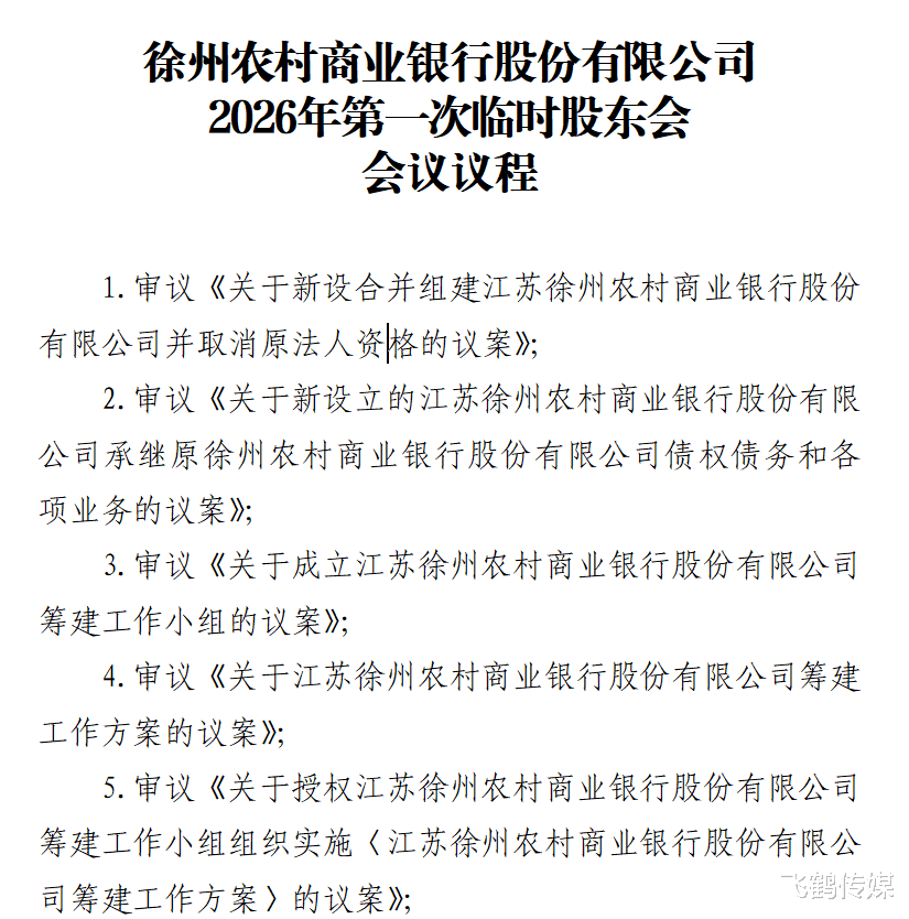 近日,徐州农商银行、新沂农商银行、丰县农商银行、睢宁农商银行、邳州农商银行、沛县农商银行等6家徐州地区的农商银行同时发布临时股东会公告,宣布于2月28日下午召开2026年第一次临时股东会,审议《关于新设合并组建江苏徐州农村商业银行股份有限公司并取消原法人资格的议案》等多项议案。
