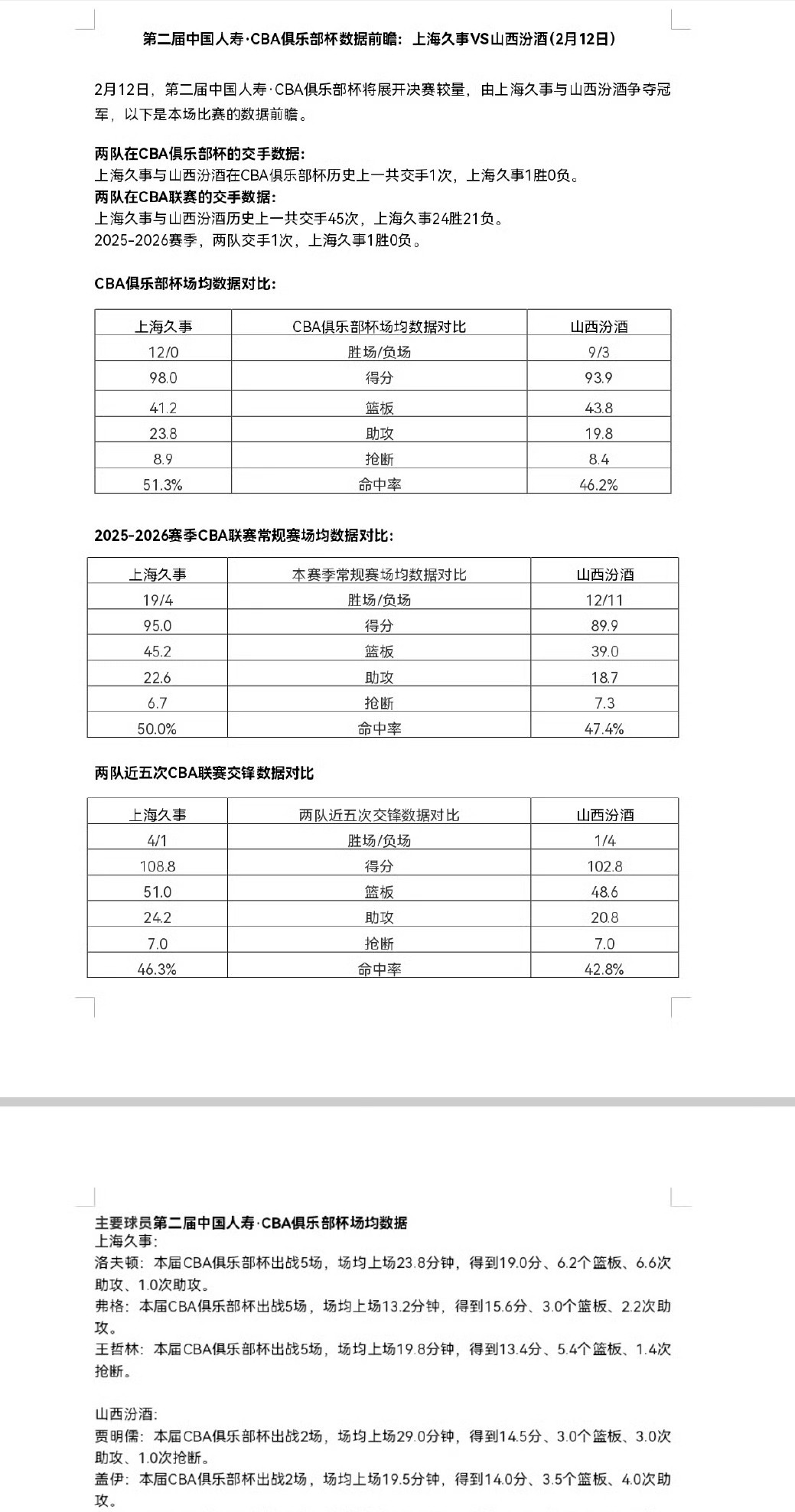 上方是山西男篮和上海男篮的数据对比,包括两队在俱乐部杯的战绩、交手胜负、常规赛战绩,以及各主力球员的具体数据。山西男篮跟上海男篮相比,全盘落入下风,没有一项是占优的。但还是那句话,竞技体育如果只看历史数据,比赛就没有打下去的必要了,记录有时候就是用来打破的。