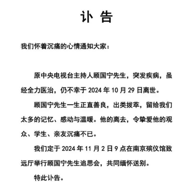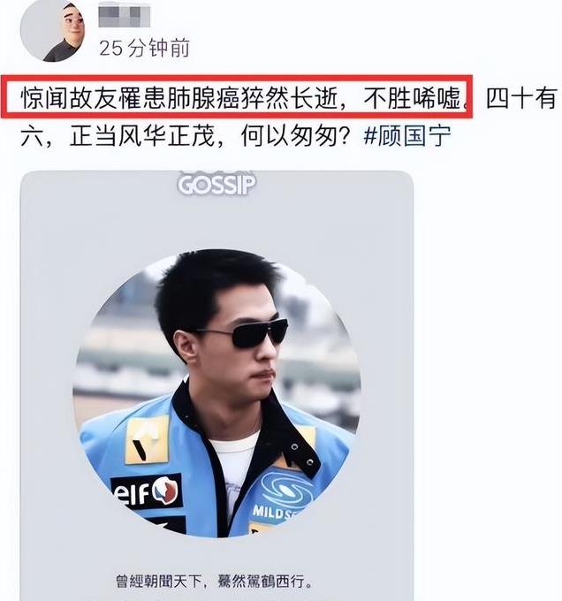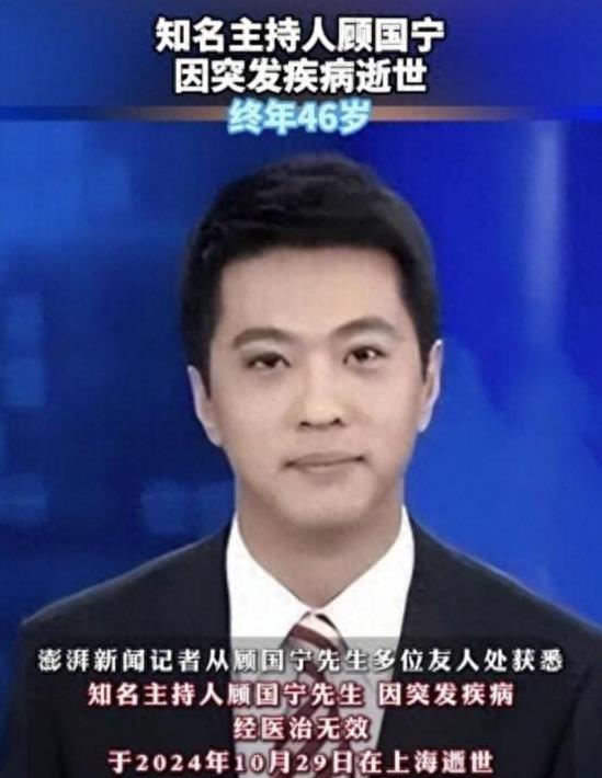 顾国宁家人发布了他病逝的噩耗:顾国宁于当天在上海一家医院去世,死因是晚期肺腺癌。据了解,顾国宁去世时年仅46岁。他生前长期患有肺部疾病,而频繁熬夜和过度劳累加重了病情。不少业内人士回忆说,2022年离婚后,顾国宁曾一度抑郁严重,酗酒成瘾。