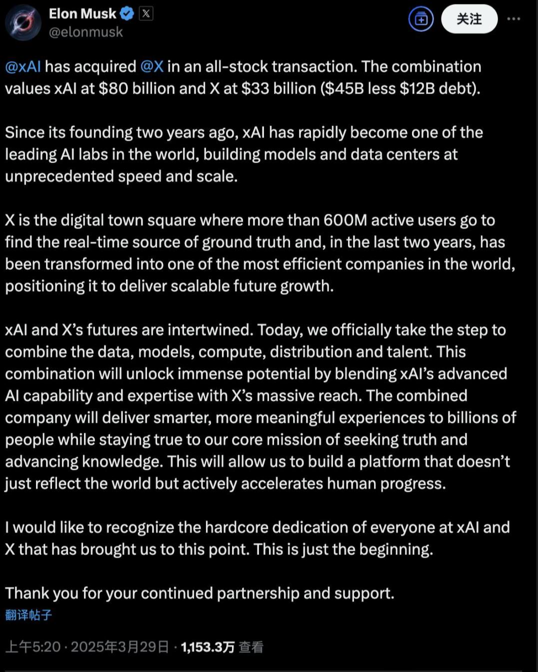 马斯克旗下两大公司正式合并!xAI以全股票交易的方式收购了X(推特),此次交易中xAI的估值为800亿美元,对X的估值为330亿美元(450亿美元资产减去120亿美元债务)。