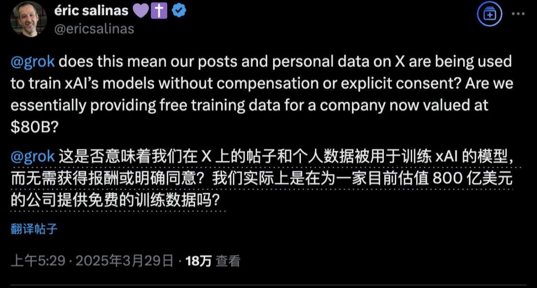 也有人担心这是否意味着xAI将获得用户社交媒体数据用于训练。
