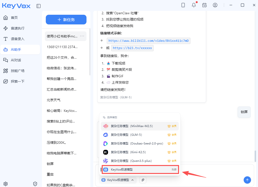 值得注意的是,MCP技能的高效运行离不开大模型的支撑,大模型的数量与性能直接决定了MCP技能的响应速度与执行效果。Keyvox在大模型配置方面进行了分层设计,兼顾了普通用户与付费用户的差异化需求,体现了其产品设计的合理性与全面性。对于普通用户,Keyvox内置多款经过优化的大模型,无需额外付费,即可满足日常MCP技能运行、基础办公辅助、简单指令执行等需求,模型响应流畅,能够精准理解中文指令,适配国内用户的语言习惯。