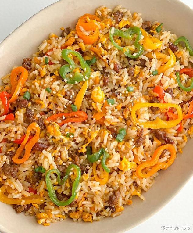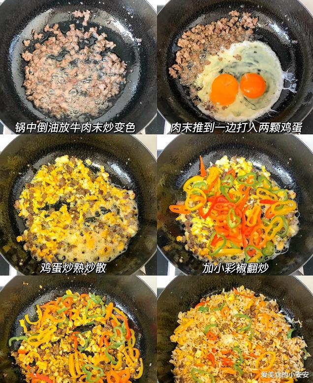 牛肉末:150g、鸡蛋:2个、小彩椒(红黄绿随意):3个、米饭:1碗、酱油:适量、食盐:适量、食用油:适量