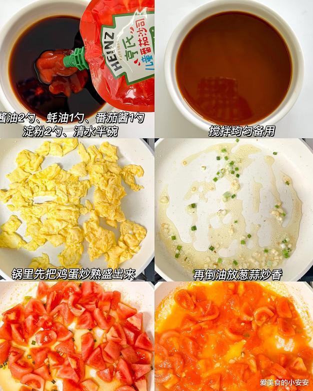 1、提前调好料汁:将蚝油、番茄酱、淀粉和清水混合均匀备用。鸡蛋炒熟盛出备用。番茄切丁备用。(番茄丁尽量切小一点,更容易炒出汁水~)