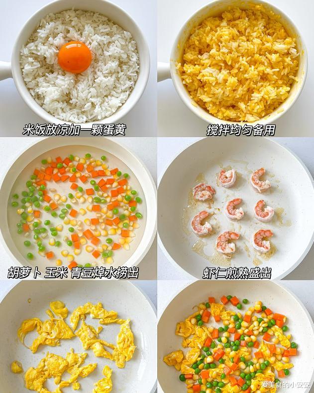 1、米饭里打入一个蛋黄,搅拌均匀。胡萝卜丁、玉米粒、青豆焯水备用。虾仁炒熟盛出。(虾仁不要炒太久,以免口感老~)