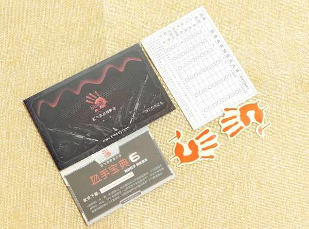 在习惯了数码产品为节约成本提高产品性价比来缩减配件的今天,血手精灵很厚道的附送了血手宝典驱动下载说明和软件使用码、2张贴纸、产品保修卡、有毒有害物质表。