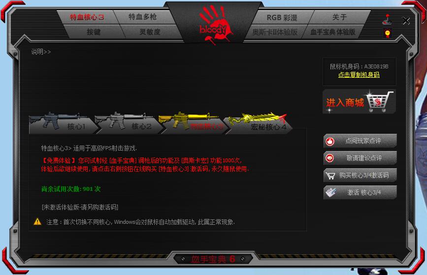 血手幽灵官方设计了驱动软件—血手宝典,第一次打开这个软件,发现真心的功能丰富。血手宝典中有些功能需要用到血手精灵官方5提供的软件码进行完整的使用。