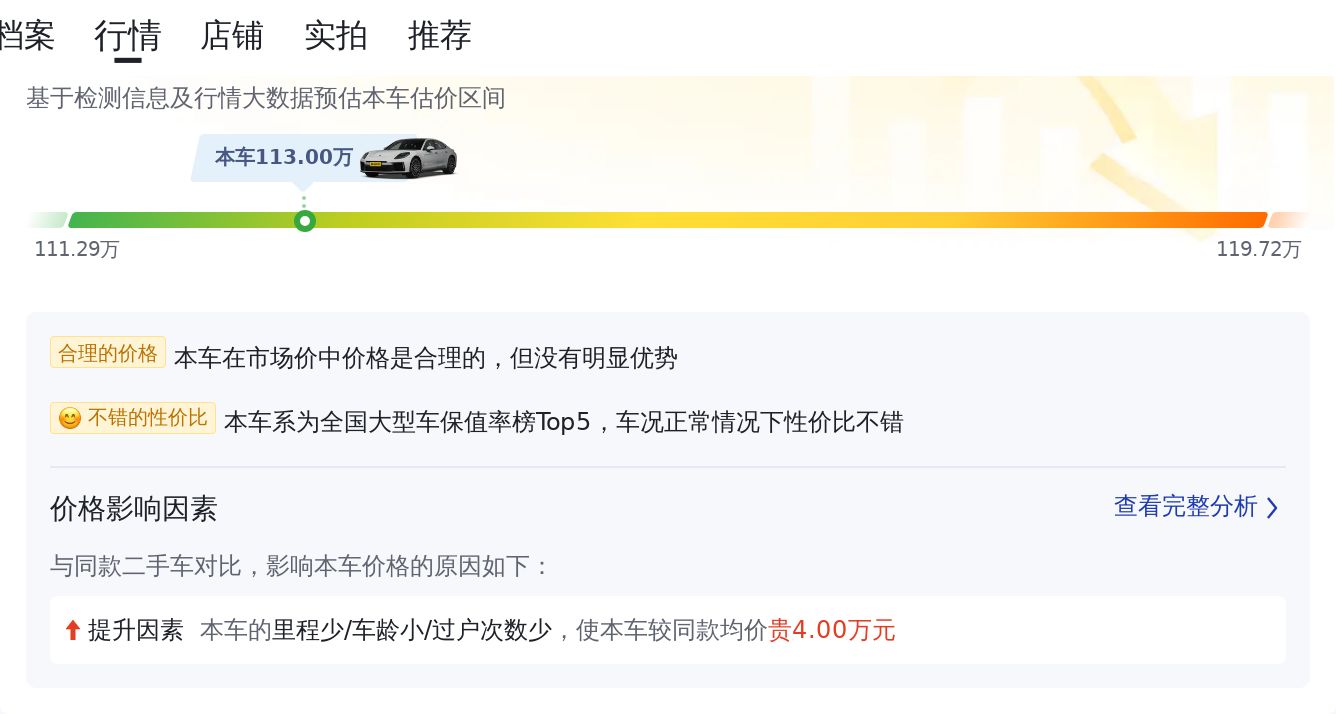 我们估算,如果按照每年 2 万公里的行驶里程来计算的话,再行驶 2 年后,这辆车的售价约为 91 万元,约折价 18.9 %。但是,请注意,车辆的售价会受到车况等多种因素的综合影响。