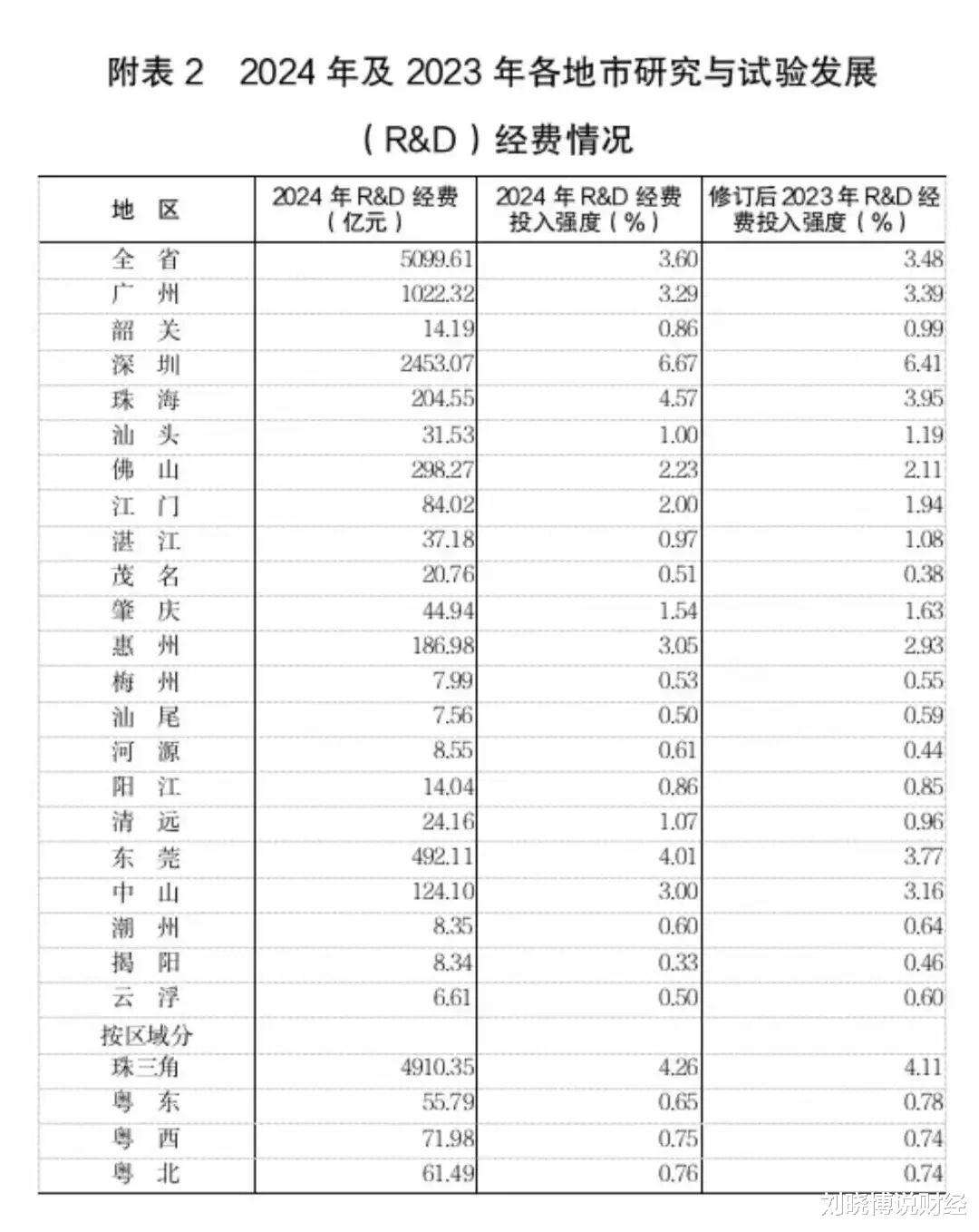 11月25日,广东省发布了2024年度研究与试验发展(R&D)经费及投入强度。其中各城市的数据如下: