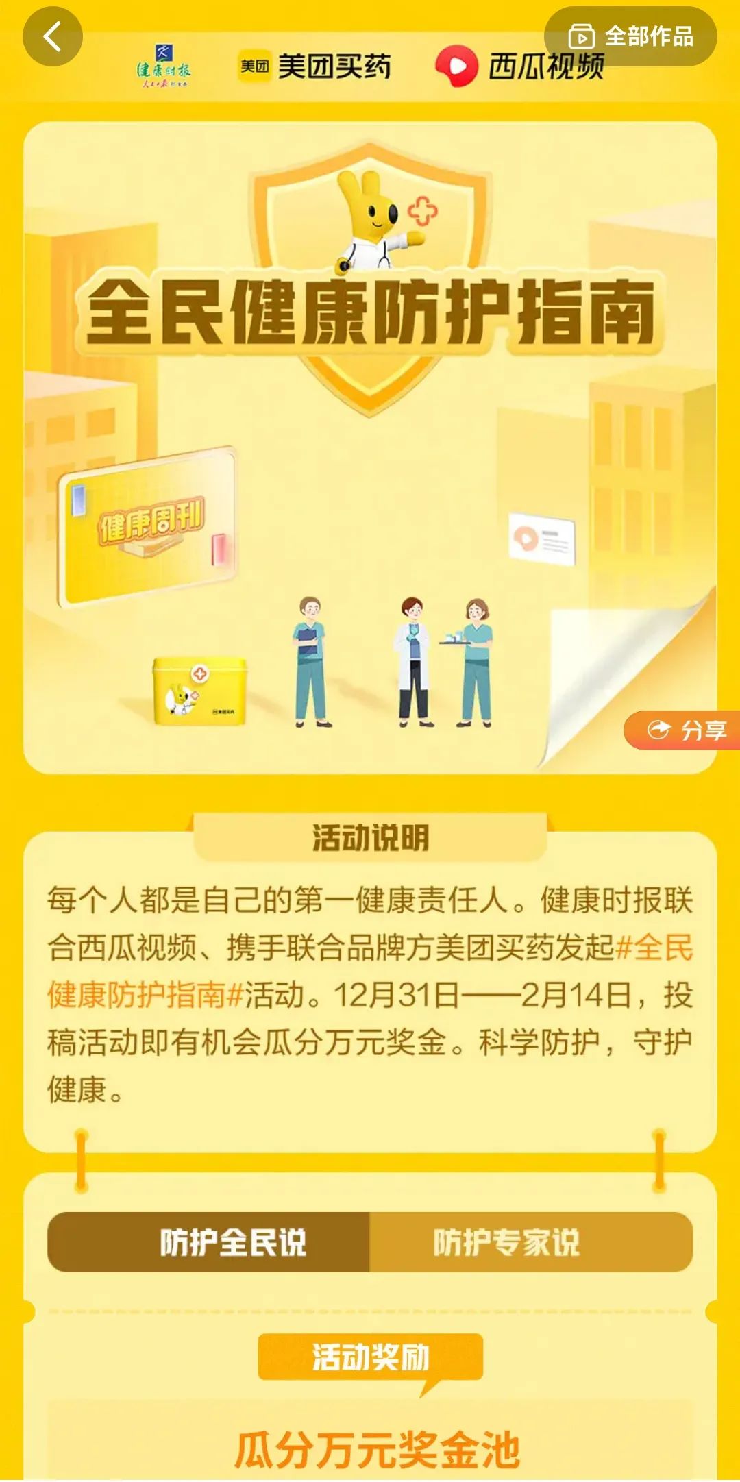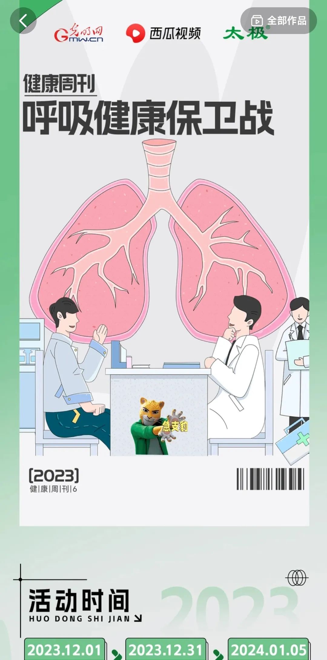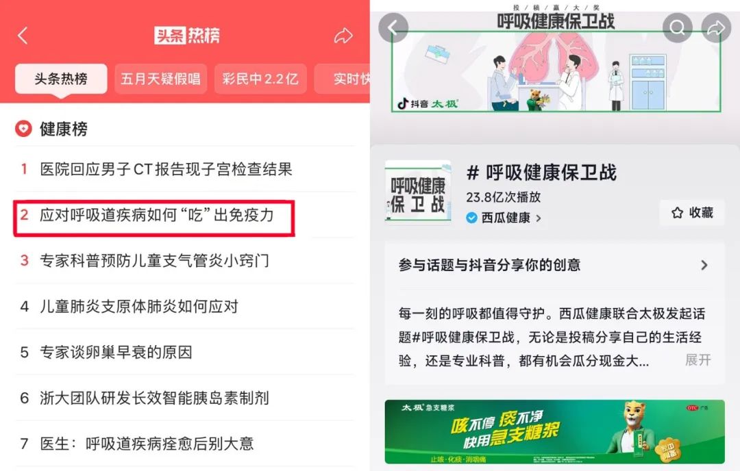 虽然相关科普内容较为专业,但专家们却能将专业医学语言转化为人人都能听懂的健康知识。诸如将民间流传方法与呼吸系统疾病防治进行融合讲述,结合生活场景的痛点,让人们在遭遇到同样情况时,知道正确的应对方式。从而大幅降低认知门槛与传播成本,实现健康知识的大范围扩散和实践应用。其次,是专业内容科普之外的用户参与机制,投稿玩法下,是“全民共创”的健康求知行为外化。话题征稿共创,掀起健康知识传播热潮。西瓜视频没有选择“自说自话”,而是以开放式的PUGC征稿活动,带动了众多科普人士与创作者达人纷纷参与其中,同时吸引了用户的自发传播。大众在了解专业健康科普知识的同时,也能随时参与讨论分享自己的观点,让健康知识真正“流动”起来。在全民范围内,进行广泛渗透——形成健康科普,就搜西瓜视频「健康周刊」IP的认知行为。最后,则是“「健康周刊」+品牌”的联合优势,联动多方为用户提供了实际的解决方案。举例来看,当下是支气管、流感高发期,西瓜视频「健康周刊」第六季便抓住了知识科普的及时性,打响“呼吸健康保卫战”,就大众关心的呼吸系统疾病痛点,邀请健康领域头部专家学者共创精准科普,#应对呼吸道疾病如何“吃”出免疫力# 的话题冲上头条热榜,#呼吸健康保卫战 抖音话题播放量达23.8亿,话题关联的热点内容被更多人看见。而急支糖浆产品优势也被更多人认识,内容的有效性则深度契合了用户需求,在品牌联动下,成为面向大众的专业知识科普的一剂良药。