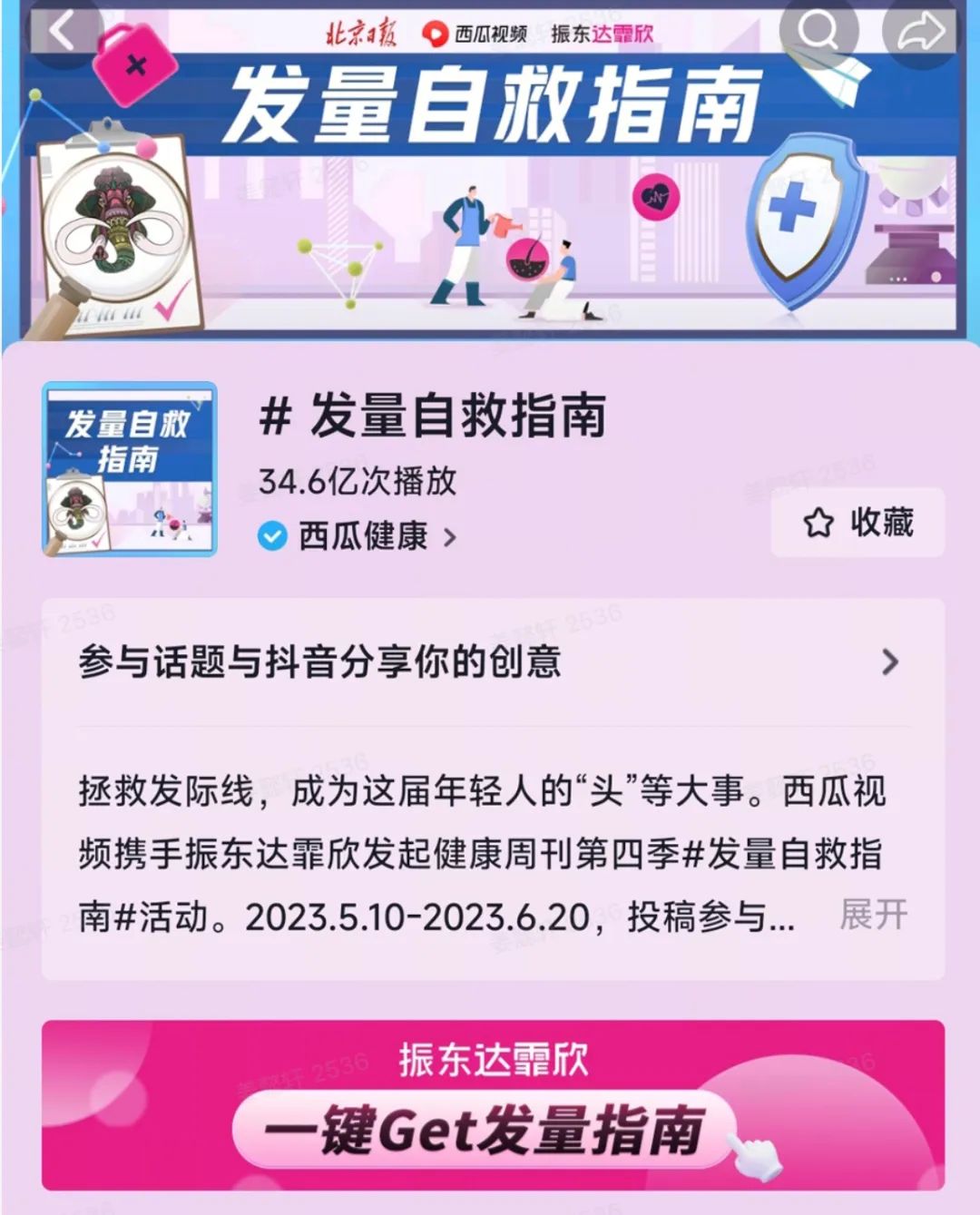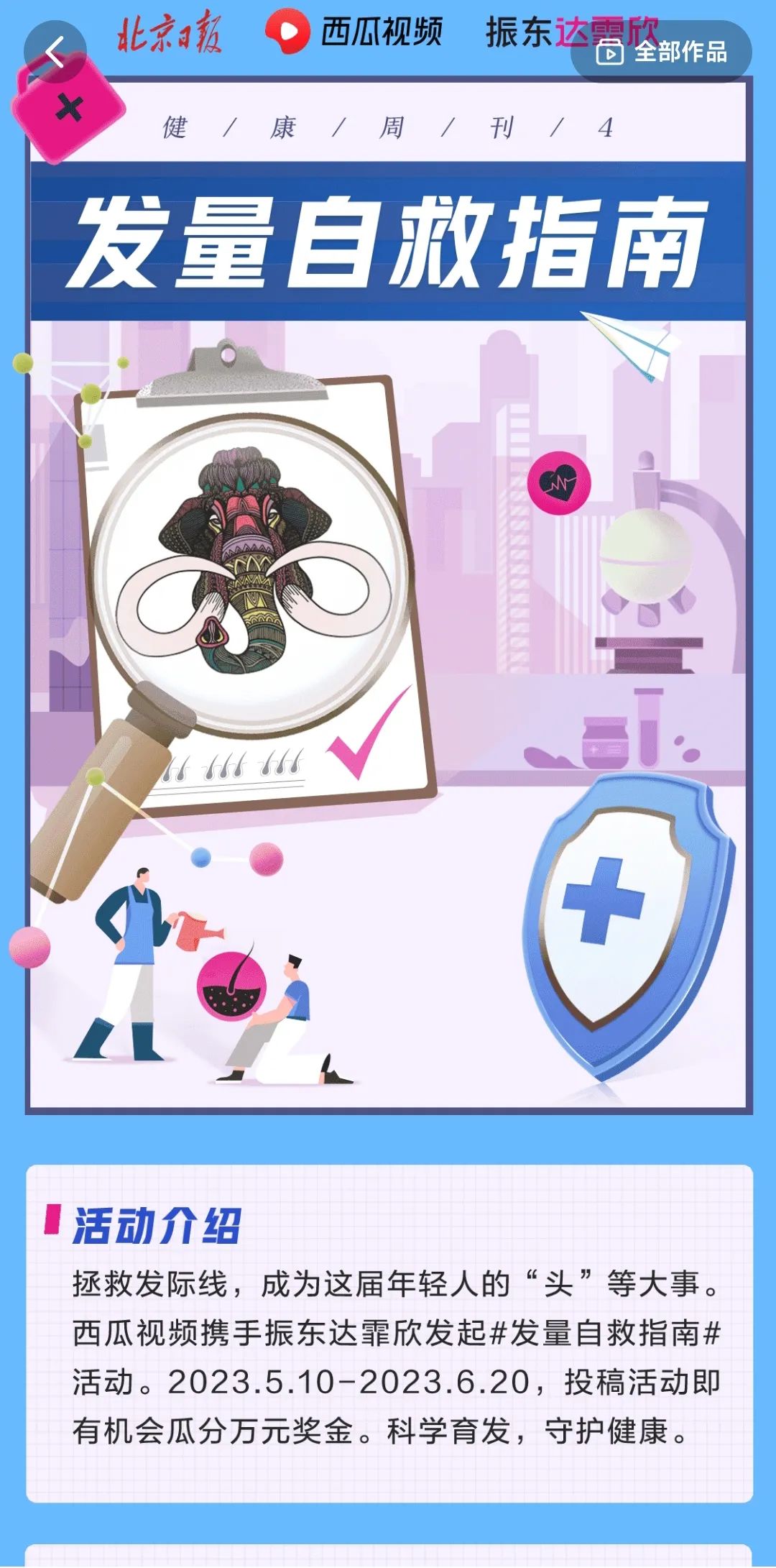 西瓜视频「健康周刊」不止追上节日、事件的热点,还非常关心年轻人最迫切的健康颜值热点——头发和视力。第四季的议题则聚焦在秃头星人的头发上,深度联动「北京日报客户端」和「振东达霏欣」推出【发量自救指南】主题活动。众多科普视频中所提及的健康养发及防脱生发方法,不仅让用户了解了能够治疗脱发的米诺地尔成分,也激发了用户对振东达霏欣品牌产品的尝试欲。同时,也带动了平台用户的广泛参与。其在抖音、今日头条话题总曝光量达35.6亿,20位健康专家科普视频总播放量超7725万。