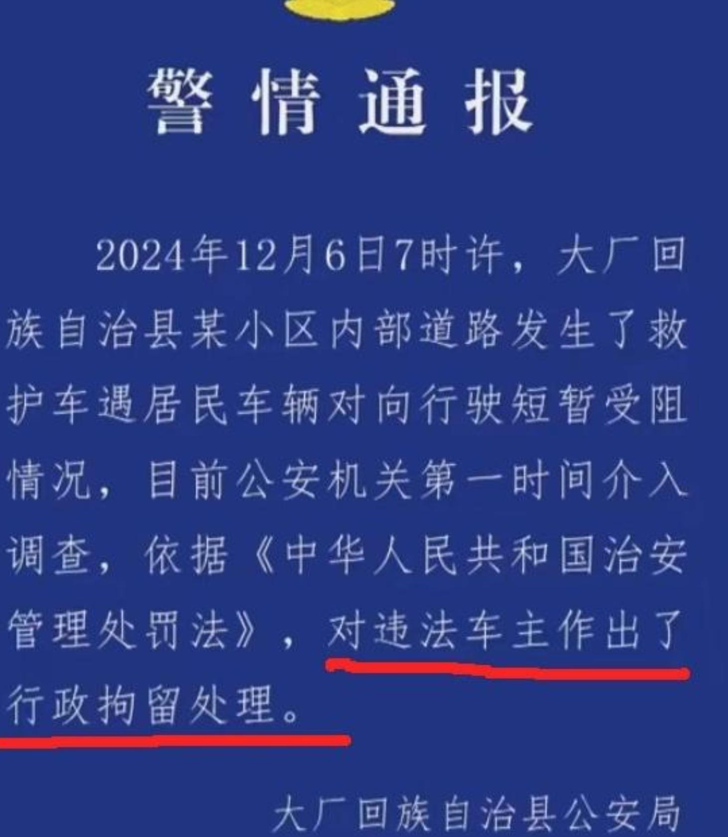 随着事件持续发酵,当地相关部门迅速介入调查,并将视频提交给警方处理。根据警方的通报,白色轿车司机因阻碍救护车执行紧急任务,被依法作出行政拘留的处罚。