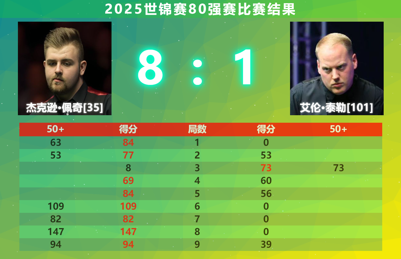比赛开局后佩奇迅速进入状态。首局他凭借单杆63分以84-0零封对手,次局再以单杆53分77-53险胜。第三局泰勒抓住机会,单杆73分73-8扳回一局,但这也是他全场唯一一次单杆50+表现。佩奇随后稳住阵脚,第四局通过缠斗以69-60艰难取胜,第五局84-56扩大比分至4-1。从第六局开始,佩奇彻底接管比赛。先是单杆109分零封对手后,他再接连以打出单杆82分、147分、94分连下三城,其中第八局的满分杆令全场沸腾。这杆147是官方的第215杆147,也是个人的第1杆147,是本赛季以来的第13杆满分杆。至此,佩奇在首阶段打出两杆破百(109分、147分)及四杆50+(63分、53分、82分、94分),而泰勒仅第三局贡献一杆73分。