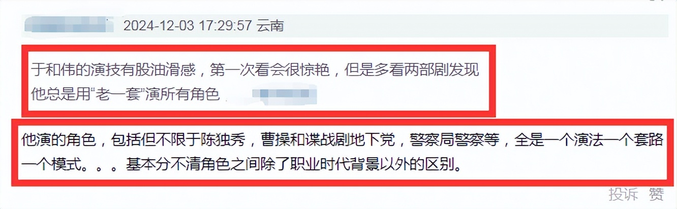 还有网友说,“于和伟的演技有股油滑感,第一次看会很惊艳,但是多看两部剧发现他总是用‘老一套’演所有角色”
