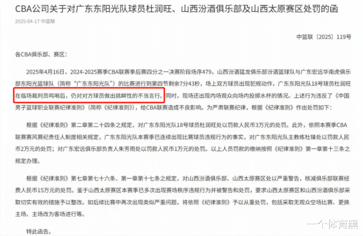 先来看广东队的这几张罚单。起因相信大家都知道了,杜润旺在比赛中与山西队外援迪亚洛发生冲突,有个挥拳的动作。CBA通告中也写的很清楚,在裁判响哨后杜润旺还继续挑衅,所以被罚款3万元。