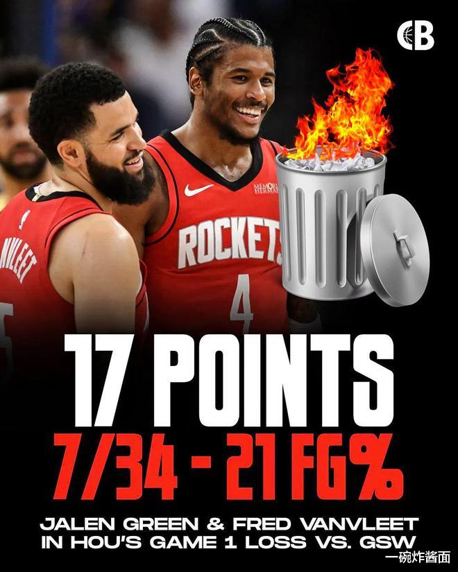 在2025年季后赛首轮G1火箭对阵勇士的比赛中,球队后场核心杰伦·格林(Jalen Green)和范弗里特(Fred VanVleet)的外线表现堪称“灾难级”,两人合计三分球17投2中(打铁15次),成为火箭进攻崩盘的关键因素。赛后球迷调侃二人是“卧龙凤雏”,虽然带有些许戏谑,但也直观反映了火箭外线火力的彻底哑火。