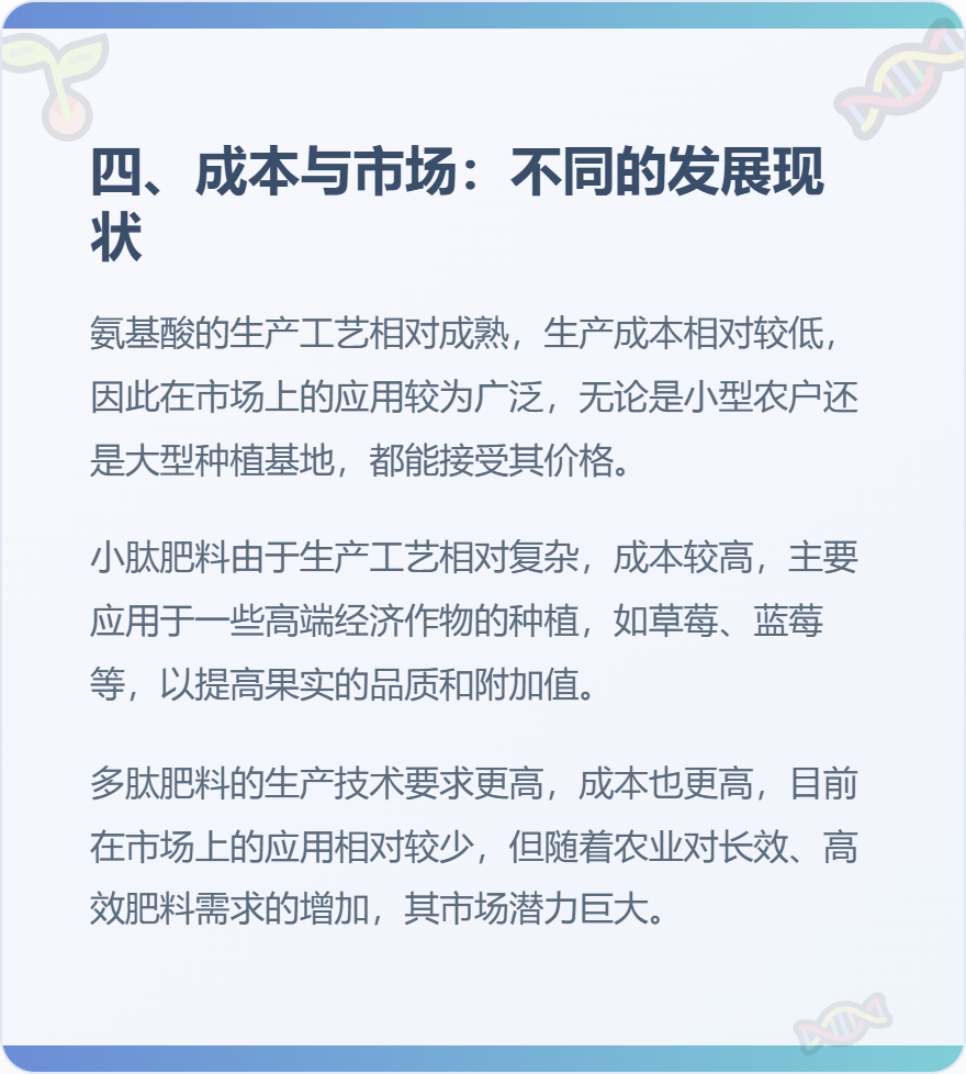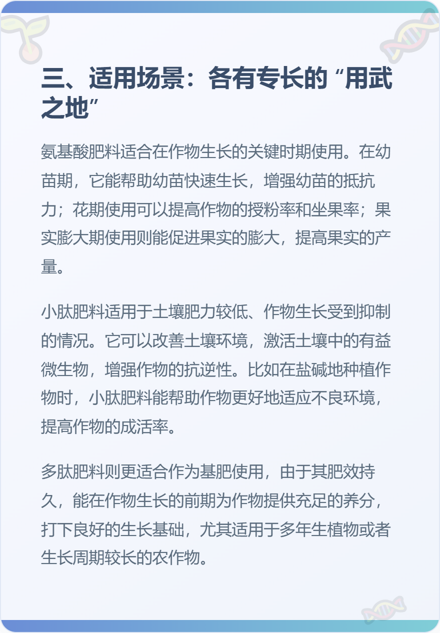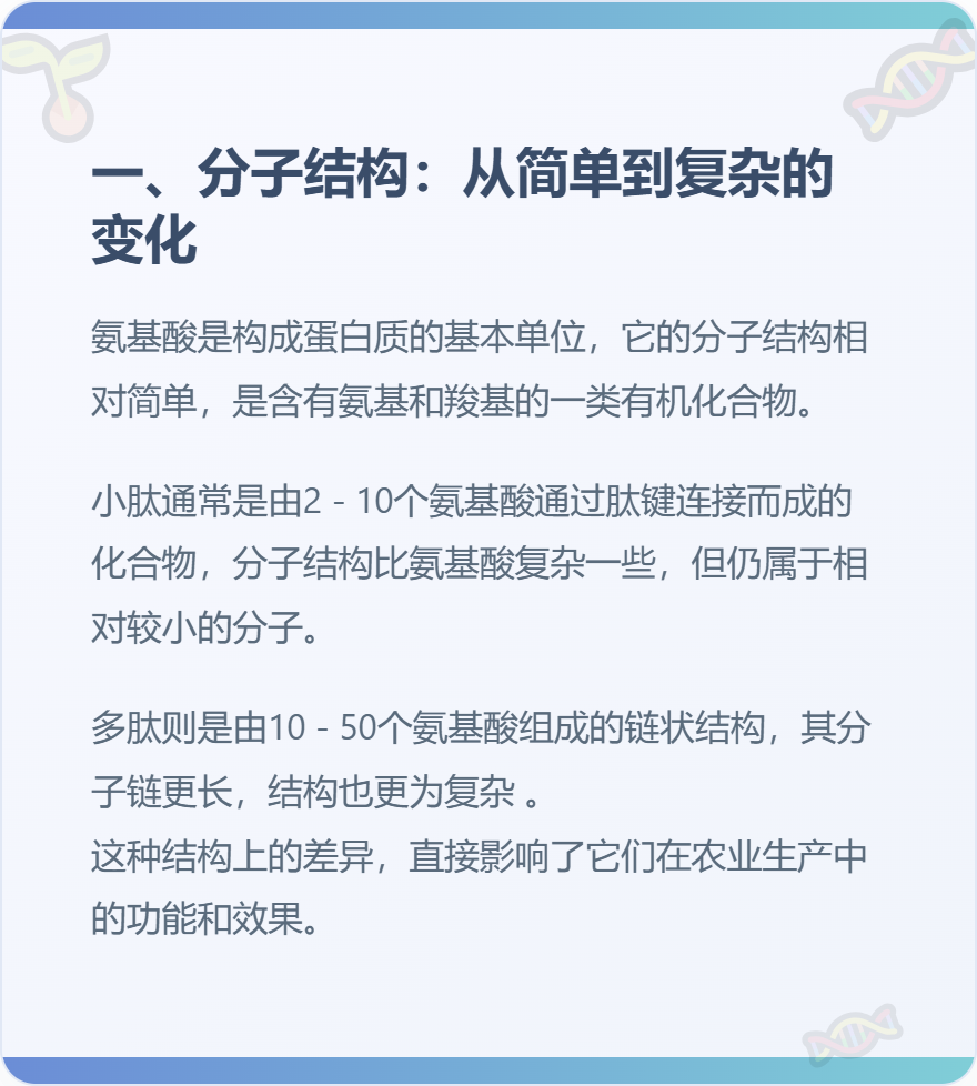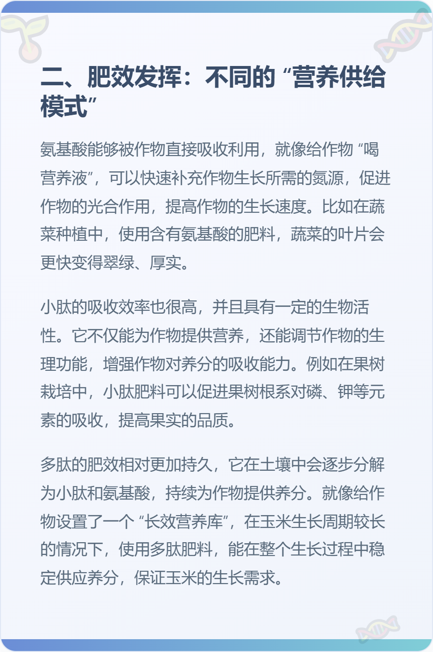 深入地了解氨基酸、小肽、多肽的特性与差异,合理的选择搭配,既能满足农作物不同生长阶段的需求,实现增产提质,又能减少传统肥料使用带来的资源浪费与环境污染。随着农业科技的进步,这些新型肥料成分将会推动农业向绿色、高效、可持续的方向发展,保障粮食的安全与生态平衡。