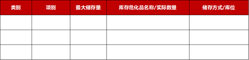 8.1.2根据确定的类别和项别,建立危化品安全特性和储存台账,并及时更新,台账格式如下: