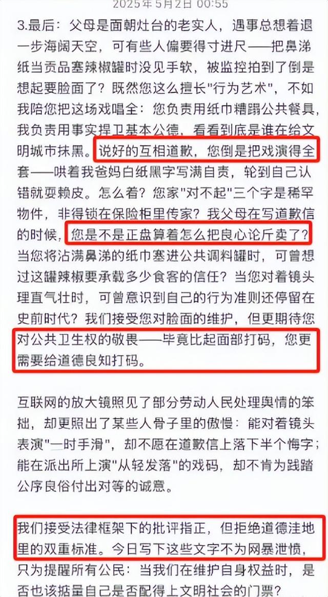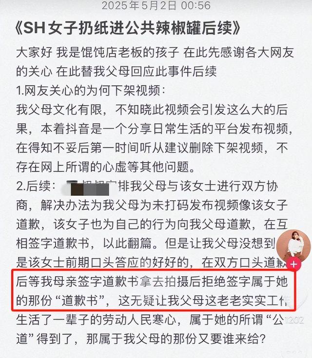 然而,这场风波并没有止步于舆论的谴责,在5月2日的凌晨,馄饨店老板的女儿在社交平台上发布了一个长文,并且揭露了整个事件背后的更多细节。