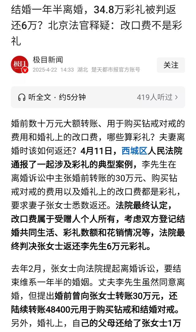 结婚一年后的夫妻,女人提出离婚,彩礼都不能全退,那男人的权利如何维护?这是另一起案件,34.8万彩礼,结婚一年半离婚,只返6万,改口费1万算赠与不能退。