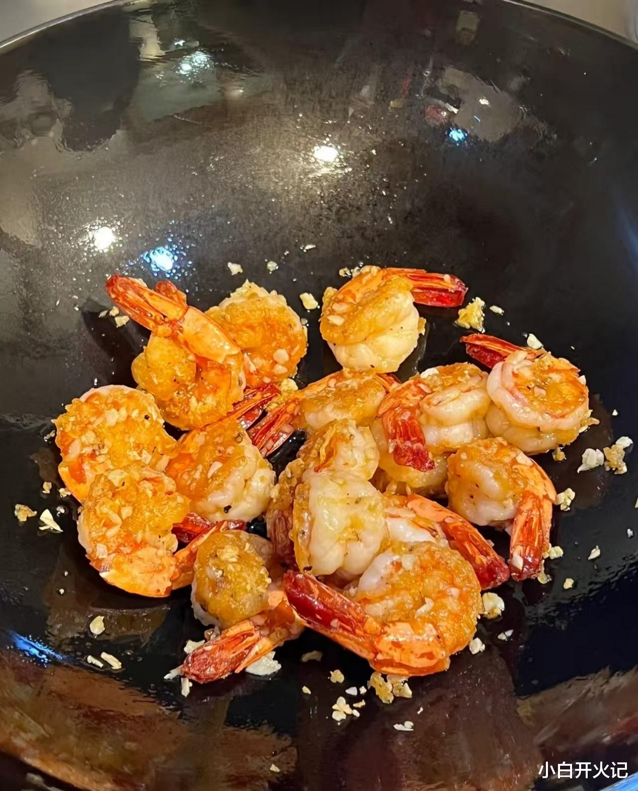 蒜粒边缘微微金黄时,把虾回锅,火调到中高,让黄油沸腾起来,用勺把蒜油不停浇在虾背上,像给它们做“奶香SPA”。这个过程持续一分钟,虾壳从粉转橘,再从橘变红,黄油也被虾肉吸得饱饱。关键时刻来了:沿着锅边淋半勺生抽、半勺蚝油,酱汁遇高温“呲啦”一声,瞬间裹住每只虾,颜色秒变高级琥珀。别炒太久,生抽带咸,时间一长腿就发黑。